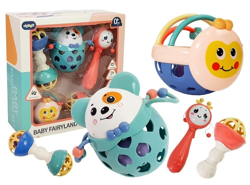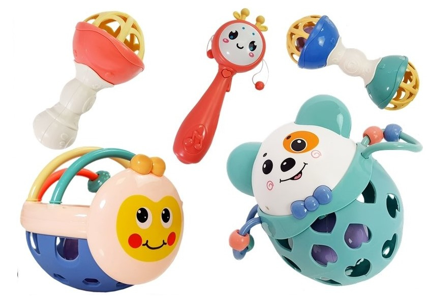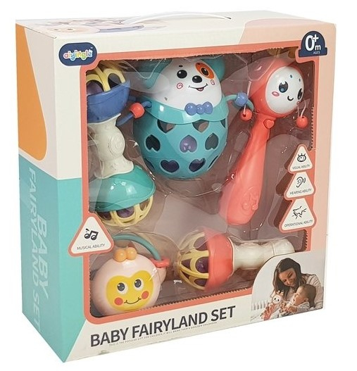 Setul conține 5 zornăitoare în culori pastelate și moi. Fiecare are părți moi și elemente care scot sunete la agitat. Designul zornăitoarelor permite o prindere ușoară de mâinile mici ale bebelușului.