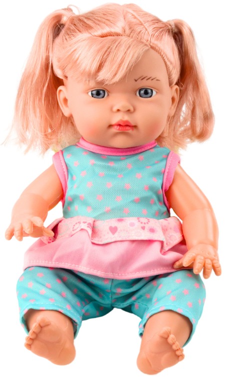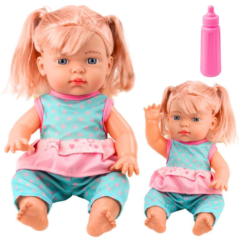 Păpușa poartă un costum turcoaz întreg, detașabil, cu buline roz și volănaș. Setul include și un biberon, ceea ce îi permite copilului să joace scene de hrănire și îngrijire.