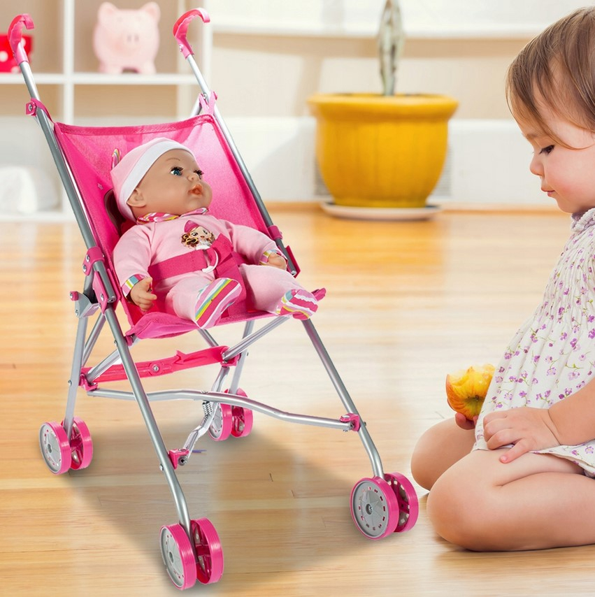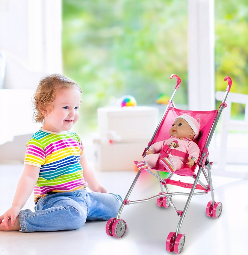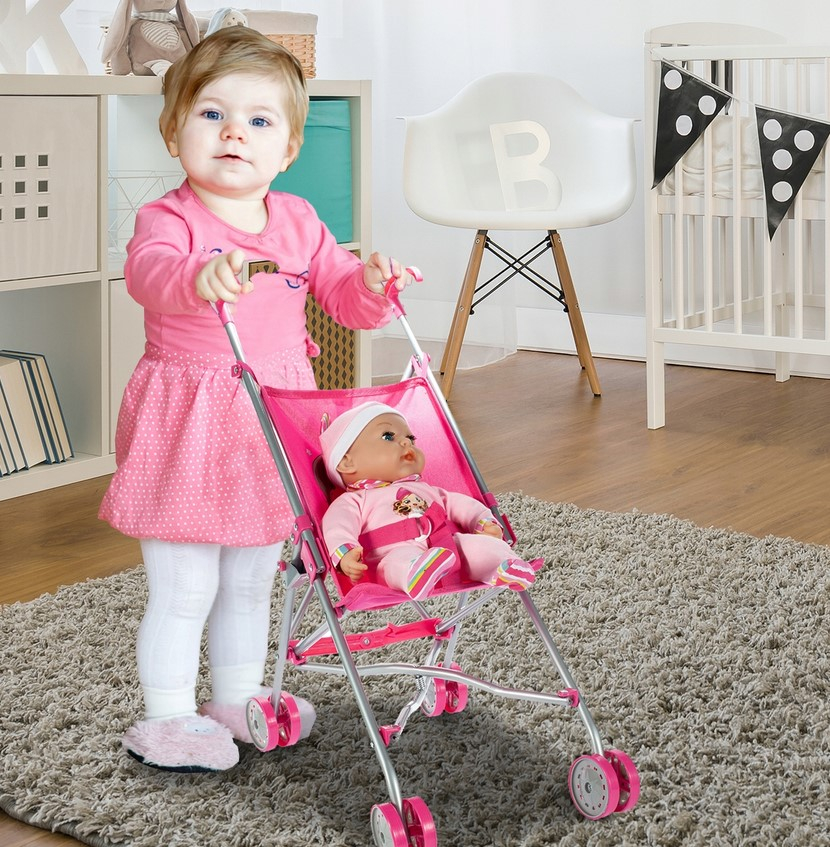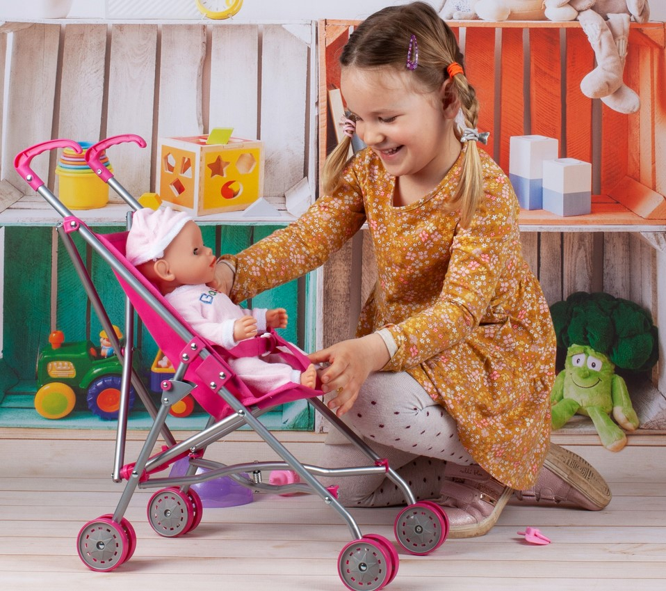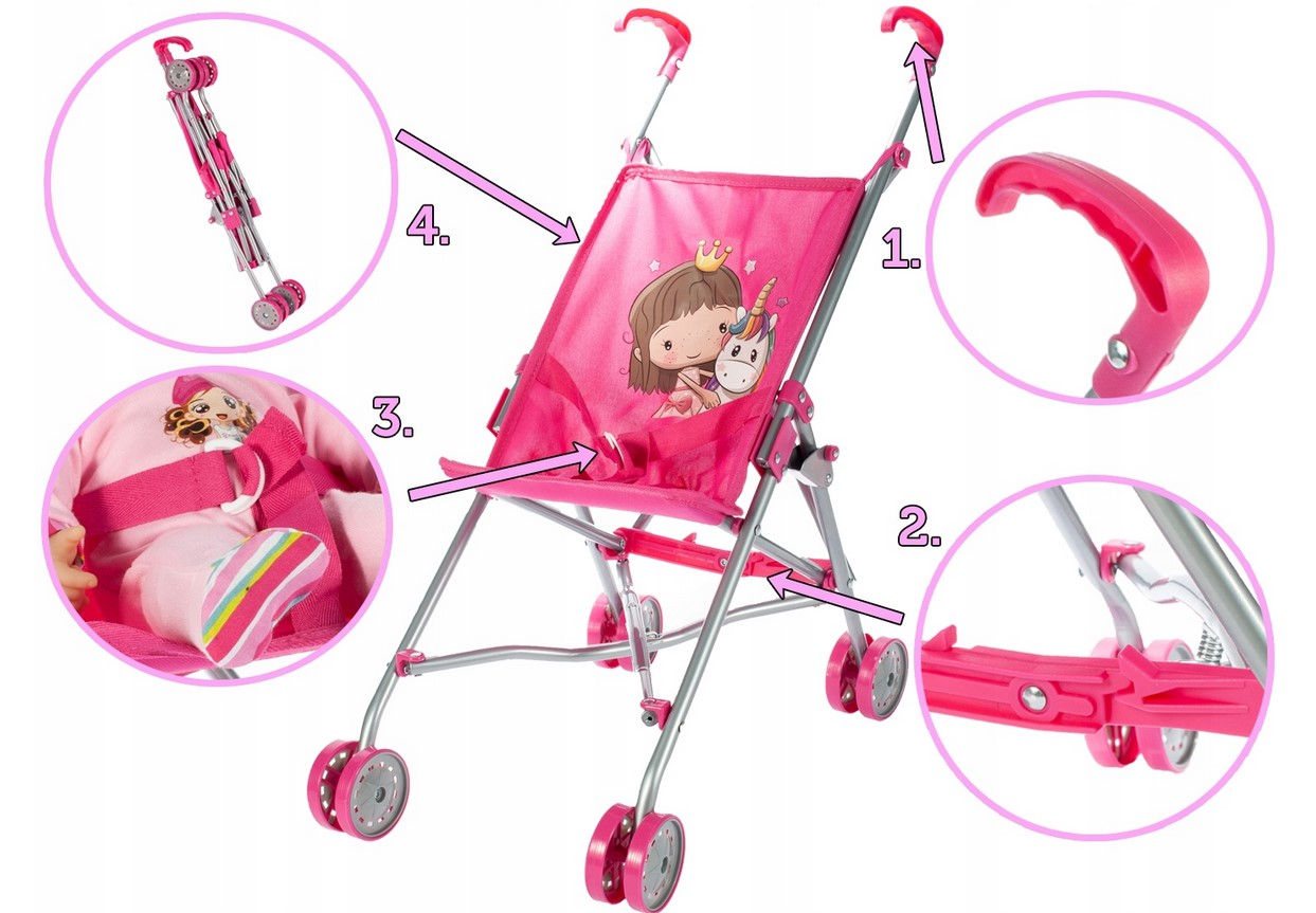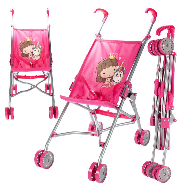 Căruciorul ideal pentru micii iubitori de păpuși! Ușor, pliabil și decorat cu un model adorabil cu unicorn, acest cărucior este perfect pentru joacă acasă sau afară.