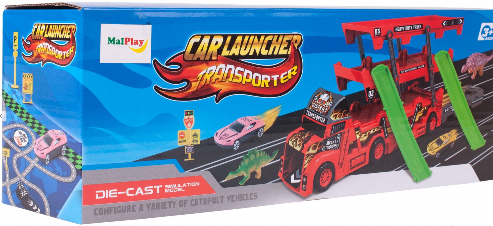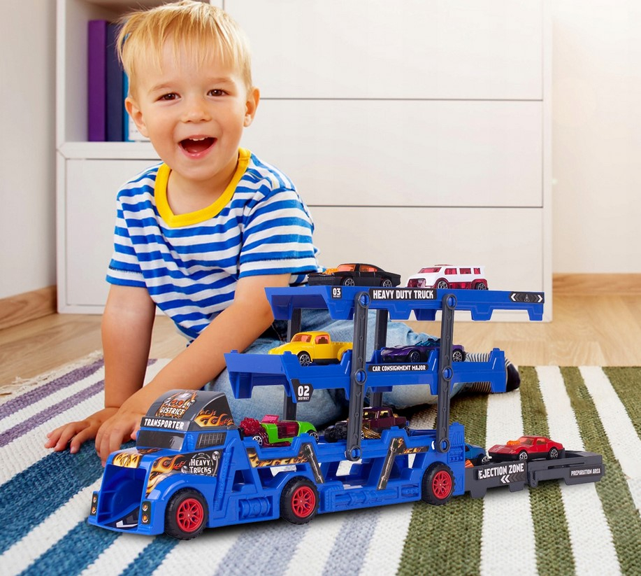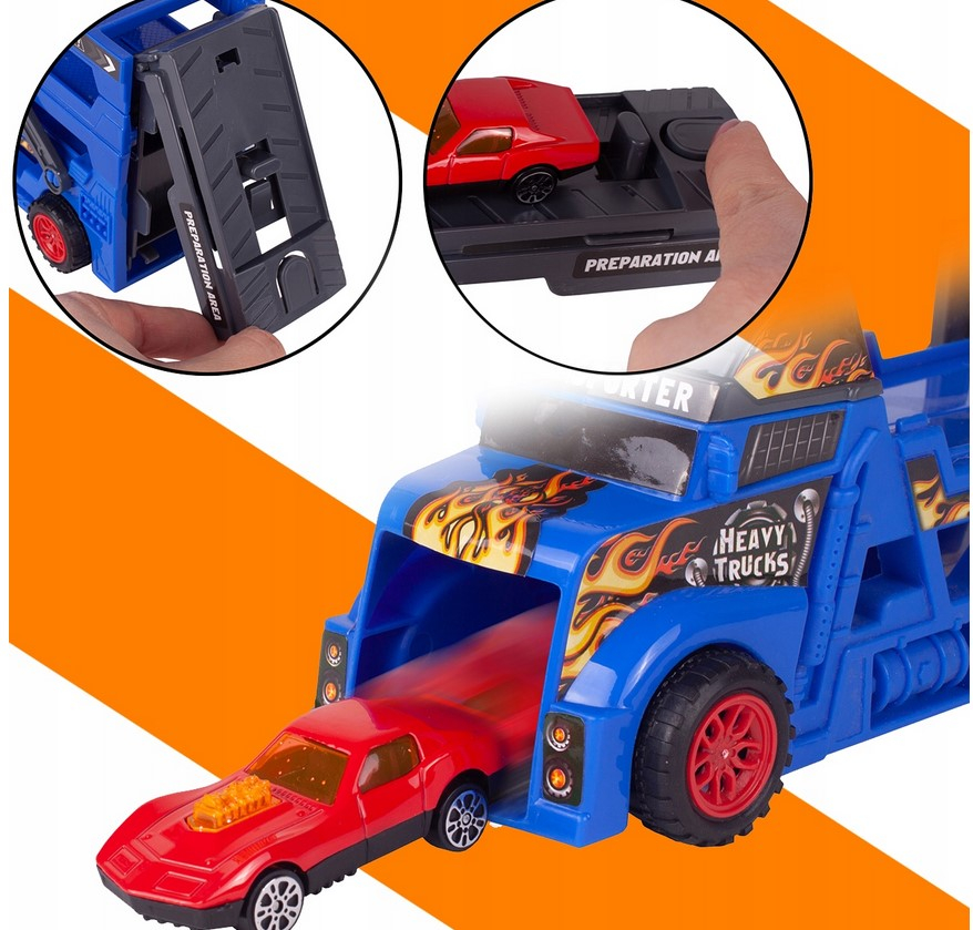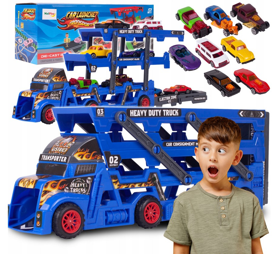 Un set complet pentru micii pasionați de mașini! Camionul transportor vine cu 8 mașinuțe metalice gata de acțiune.