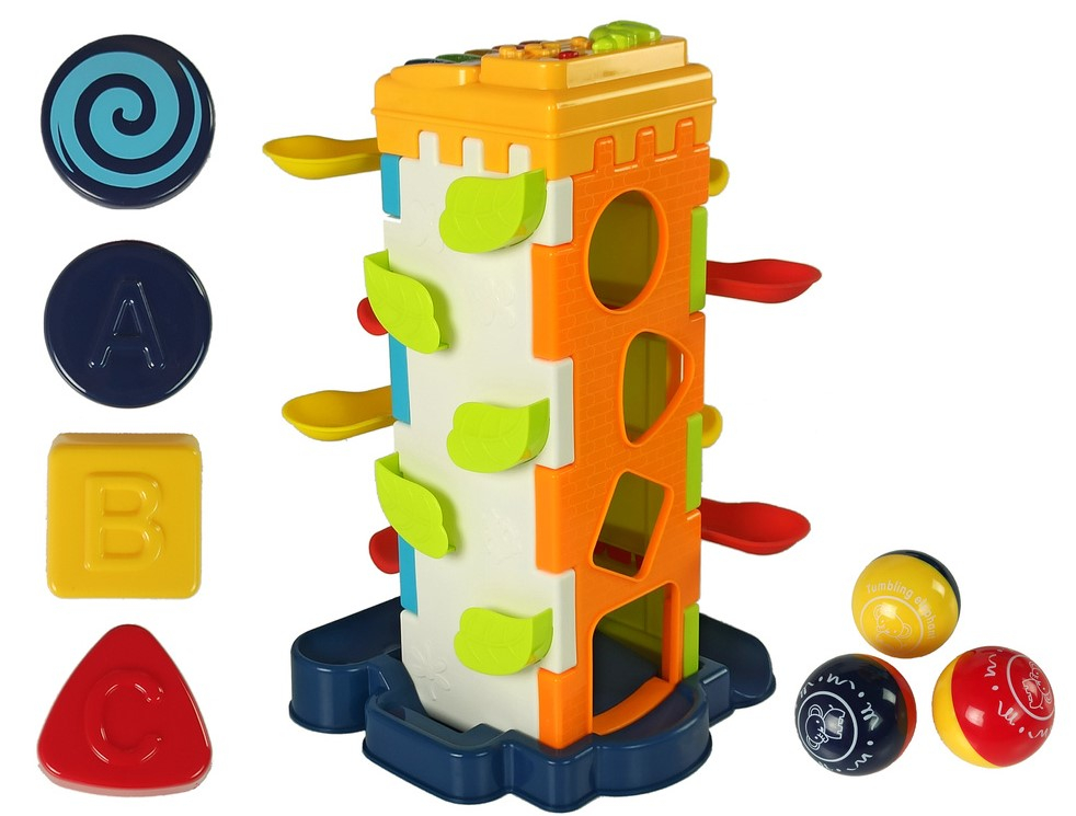 Introdu bilele în orificiul de pe prima platformă și privește-le cum coboară de la un nivel la altul. Pe cealaltă parte se află un sortator unde copilul poate introduce formele corecte.